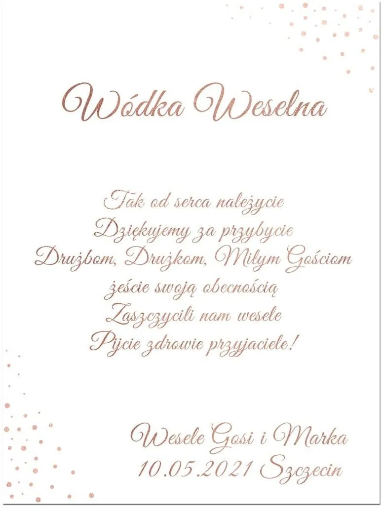 Co wyróżnia nasze etykiety? Każda z nich zawiera inny, zabawny lub wzruszający wierszyk związany z weselem i toastami. To nie tylko estetyczny dodatek, ale także element, który rozbawi gości lub wprowadzi ich w nastrój pełen wzruszeń. Dzięki temu każda butelka staje się niepowtarzalna, a wspólne wznoszenie toastów zyskuje zupełnie nowy wymiar.
