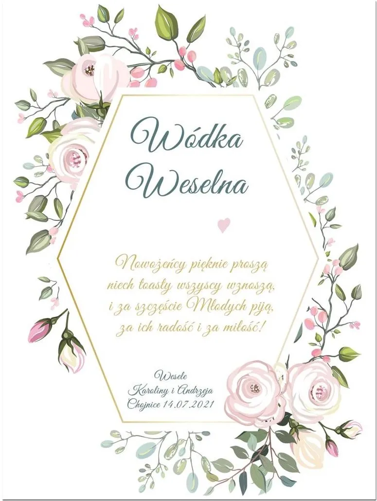 Chcesz, aby Twoje wesele było dopięte na ostatni guzik i wyróżniało się dbałością o szczegóły? Nasze personalizowane etykiety samoprzylepne na butelki z wódką weselną to drobny akcent, który zrobi wielkie wrażenie! Dzięki eleganckiemu kwiatowemu motywowi oraz unikalnym wierszykom na każdej etykiecie, Twoje stoły zyskają wyjątkowy charakter, a goście z pewnością to zapamiętają.
