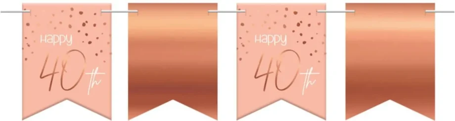 Baner urodzinowy Happy 40th w kolorze różowego złota z zestawu Elegant Lush Blush na czterdzieste urodziny.Długość: 600 cm.Wysokość flagi: 23 cm.Opakowanie 1 szt ( 10 flag).